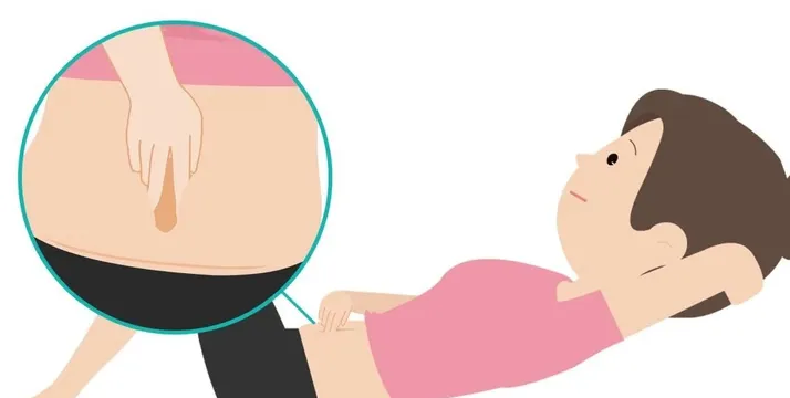 仰卧位,双手放在胸前,头和肩轻轻抬离床面,如做仰卧起坐一样,用尺子(或手指)测量腹部肌肉间隙,在脐上和脐下下4.5cm处进行评估,≥2cm就说明存在腹直肌分离。